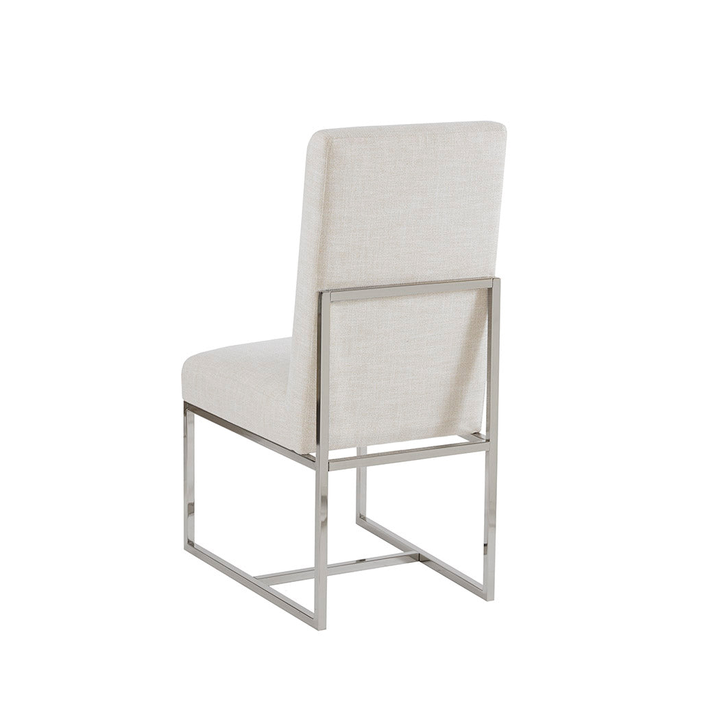 Give your dining room a simple and modern look with the Madison Park Junn Dining Chair 2 Piece Set. Upholstered in a soft natural-hued fabric, these dining chairs feature a brushed nickel plated finish on the metal legs to create a rich contemporary allure. Available in a two piece set, these modern dining chairs introduce a simple elegance to your dining décor. Assembly is required and tools are included for your convenience.
