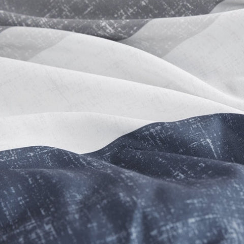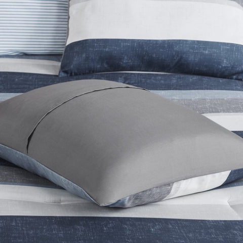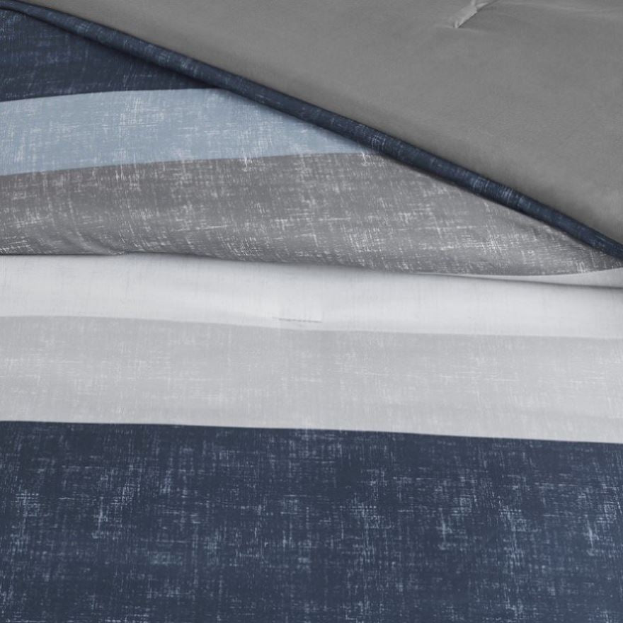 Revamp your bedroom style with the Madison Park Essentials Jaxon bed in a bag. This modern comforter set features a stripe pattern in alternating grey, navy, and blue colors that’s pair with a solid grey reverse to create a casual vibe. The included sheet set has a coordinating stripe design to complement the soft and cozy comforter’s look. Included in the set is 1 comforter, 2 shams (1 in Twin), 1 flat sheet, 1 fitted sheet, and 2 pillowcases (1 in Twin). The fitted sheet fits up to 14"(12"for Twin size) mattress depth. This machine washable bedding set is OEKO-TEX certified and features an antimicrobial treatment, which inhibits bacteria growth and keeps the bedding fresher for longer. Totally refresh your space without breaking the bank with this complete comforter set with bed sheets.