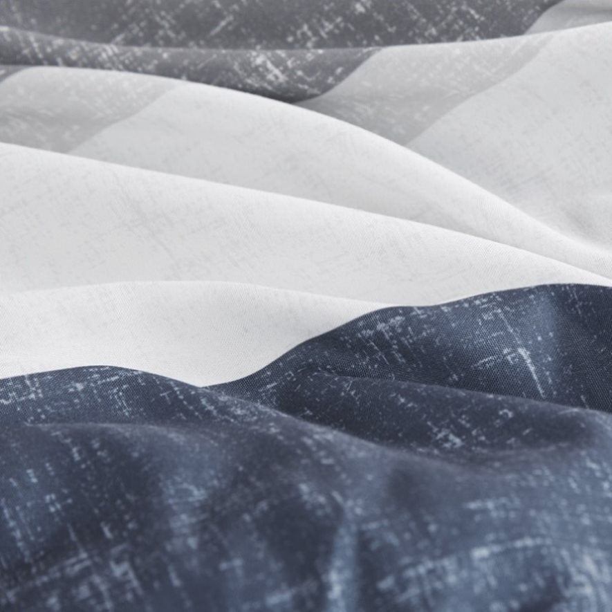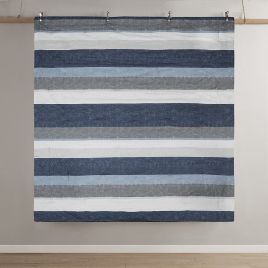 Stripe comforter look in grey, navy, blue for casual and modern bedroom style with simple coordinating stripe design on sheet set
