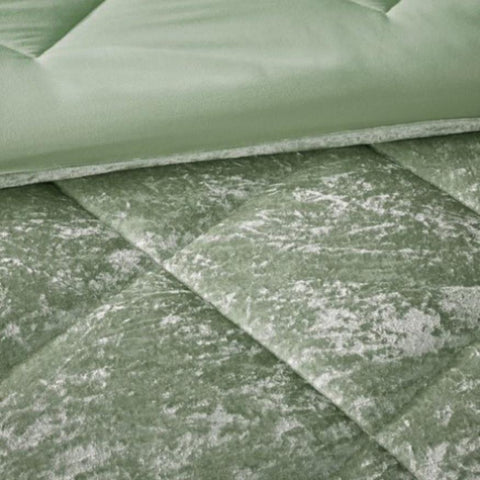Luxurious crushed velvet comforter set features diamond quilting on top of the bed