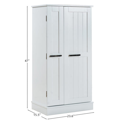This pantry cabinet measures 23.6"W x 15.75"D x 46.8"H. Constructed with MDF and safe scratch-resistant coating, this kitchen pantry storage cabinet is high-quality and with no unpleasant odors. There are five shelves inside and four shelves on one side of the inner door.