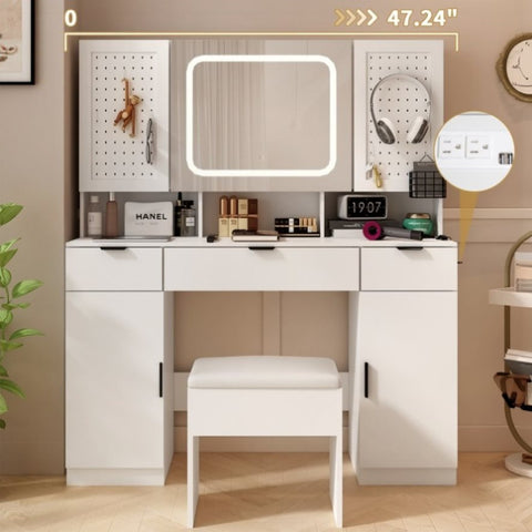 Transform your daily routine with this elegant and modern vanity table set. With a beautifully lit mirror that offers adjustable brightness and 3 lighting modes, this vanity creates the perfect setting for makeup application, skincare, or hairstyling. Storage shelves behind the mirror and two pegboards, together with 3 drawers and 2 cabinets, offer plenty of space to keep your beauty essentials organized. Combining modern aesthetics with practical design, this vanity set adds a luxurious touch to your bedroom or dressing area, creating a personal space where you can feel pampered and inspired every day.