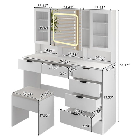 Transform your daily routine with this elegant and modern vanity table set. With a beautifully lit mirror that offers adjustable brightness and 3 lighting modes, this vanity creates the perfect setting for makeup application, skincare, or hairstyling. Storage shelves behind the mirror and two glass doors, together with 7 drawers, offer plenty of space to keep your beauty essentials organized. Combining modern aesthetics with practical design, this vanity set adds a luxurious touch to your bedroom or dressing area, creating a personal space where you can feel pampered and inspired every day.