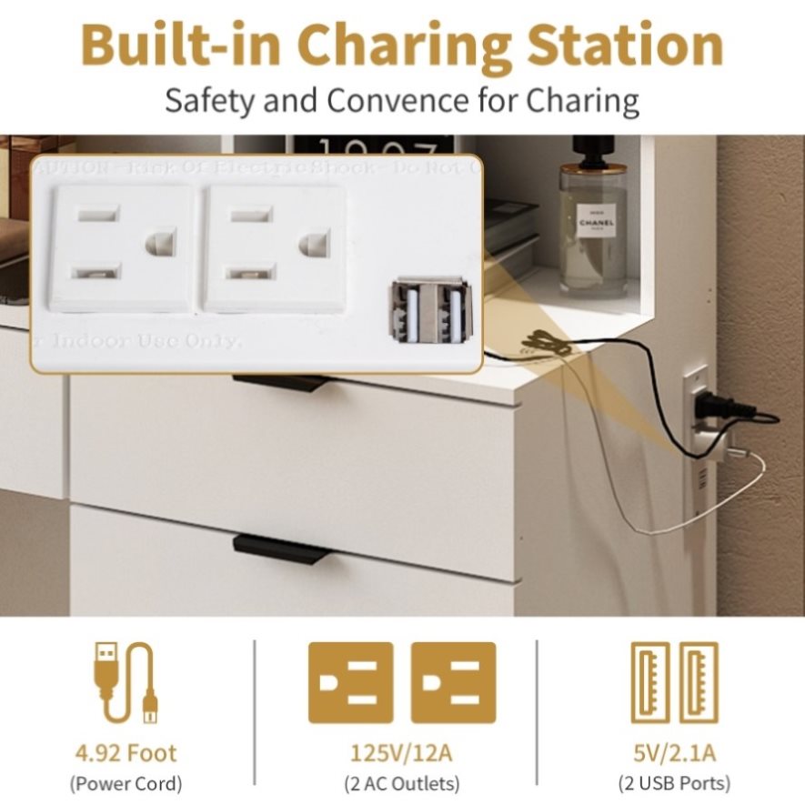 3. Convenient Charging Station with USB Ports: The built-in power strip includes 2 standard plug sockets and 2 USB ports, making it easy to charge your devices or use your hair dryer and curling iron while seated at your vanity.