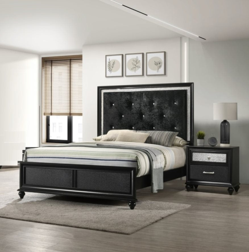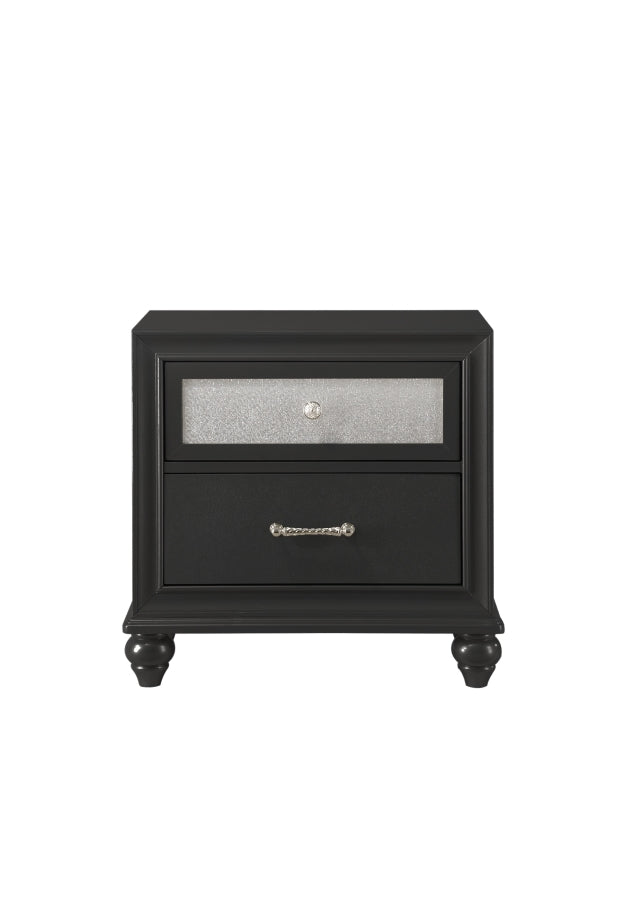 bedroom. It features two drawers with bar handles and knobs, glitter accents on the top drawer front, and comes in a black finish.