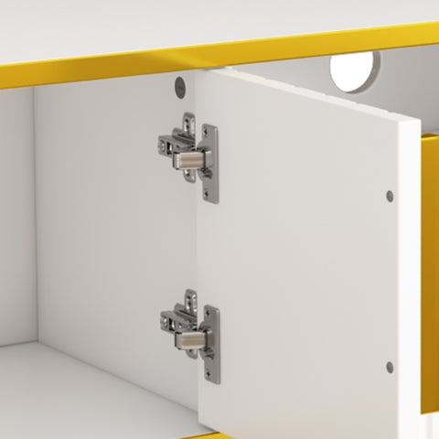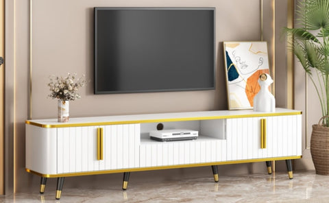 | Count This TV cabinet integrates the simple line design and the embellishment of golden elements, not only showing the modern fashion style, but also exuding a hint of luxury and elegance. The rear panel of the open storage shelf features a circular cable hole, which is convenient to connect power and multimedia devices. The smart design of this TV cabinet has two cabinets, a drawer and an open storage shelf. Which can be used separately to store items of various sizes. Made of durable particle board and MDF, this TV stand has a good load-bearing capacity and scratch-resistance. |