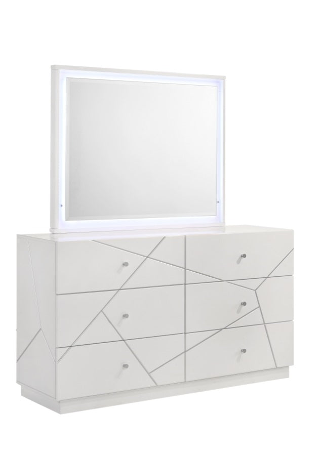 Elevate the sophistication of your bedroom with this stunning dresser, combining utility with a touch of modern design. Finished in a pristine lacquer, it features a geometrically inspired surface that adds depth and visual intrigue. The dresser includes six spacious drawers that glide smoothly on metal runners, making it as functional as it is stylish. Each drawer is fitted with a sleek handle, providing a modern touch and ensuring easy access to your belongings. The top drawers are lined with luxurious red velvet, offering a soft surface ideal for storing delicate items. This piece not only provides ample storage but also acts as a statement piece in any contemporary bedroom setup.