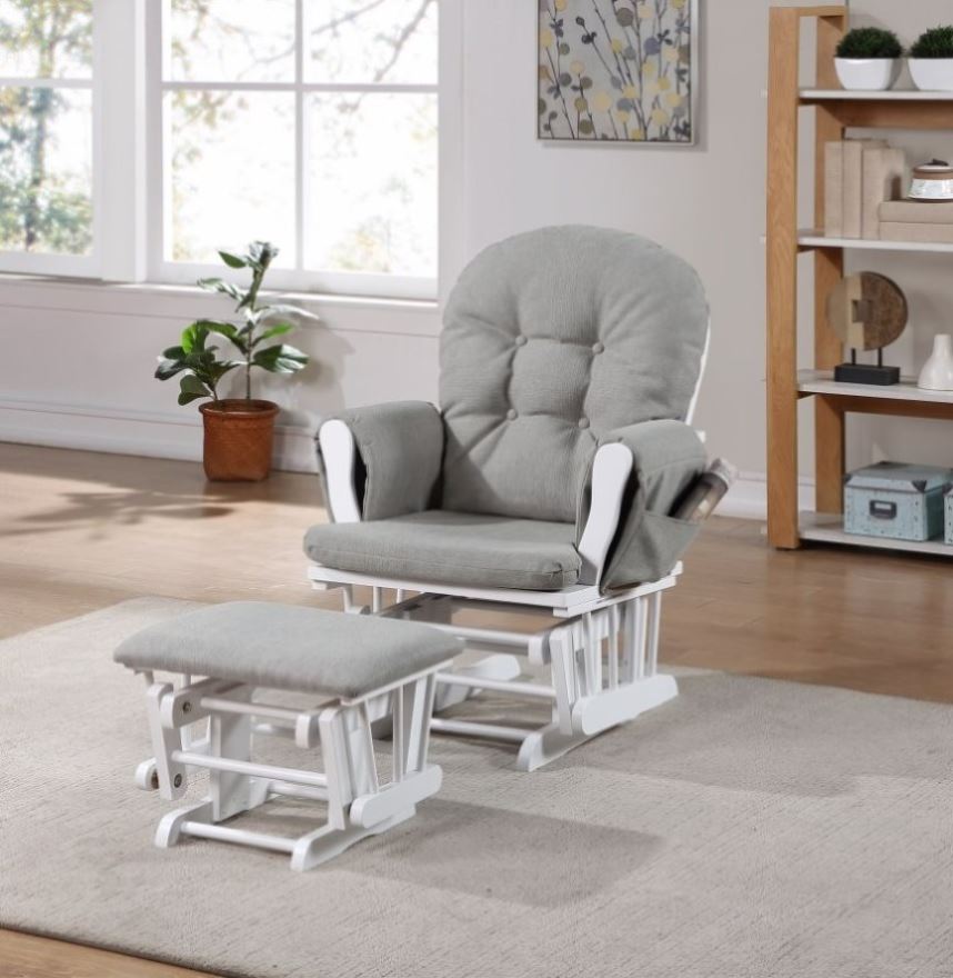 The Suite Bebe Mason Glider and ottoman offer soft quiet gliding motion, and over stuffed back cushion with appointed button tufting