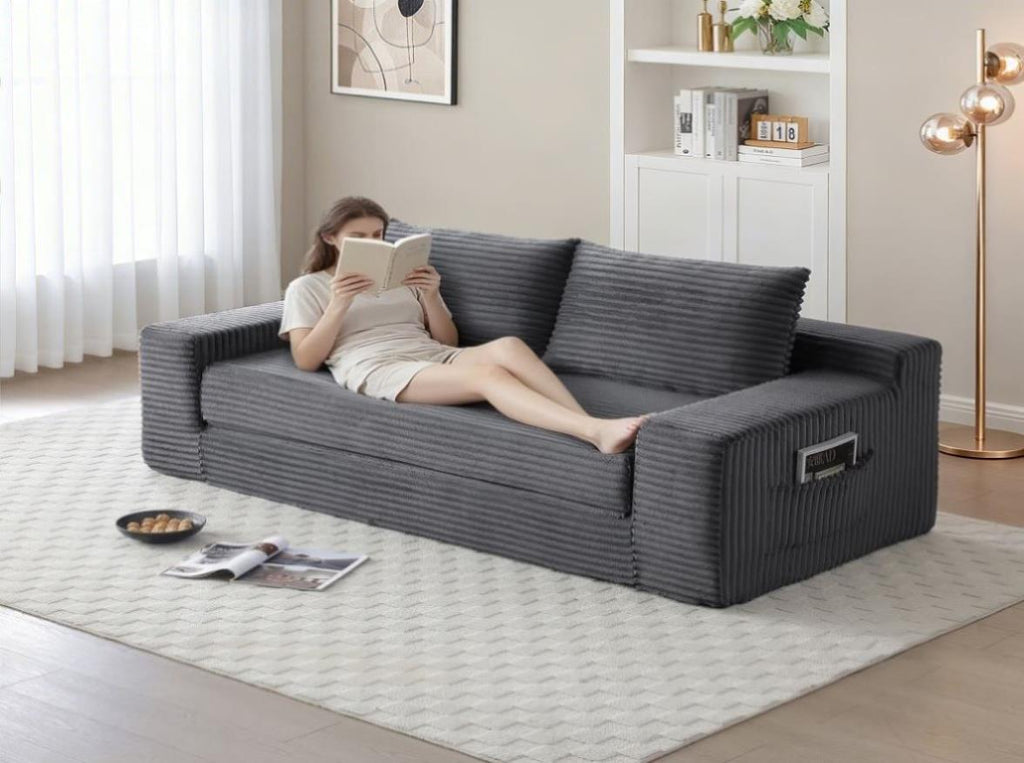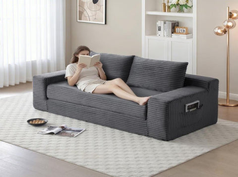 Corduroy boneless cloud couch design with high-density foam filling. No frame for ultimate relaxation and creates a cozy lounge sofa experience. Soft velvet fabric cover is durable and super comfy to touch