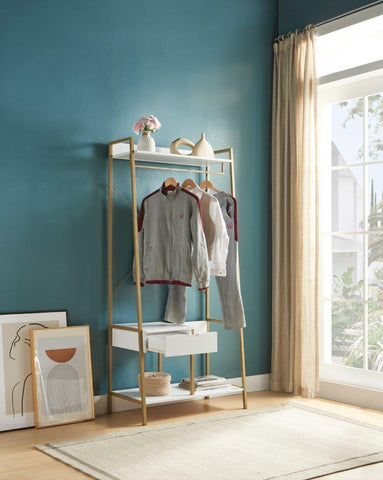 Metal Clothes Rack Open Wardrobe Free Standing with One Drawer Hanging Clothes Rod – White & Gold
