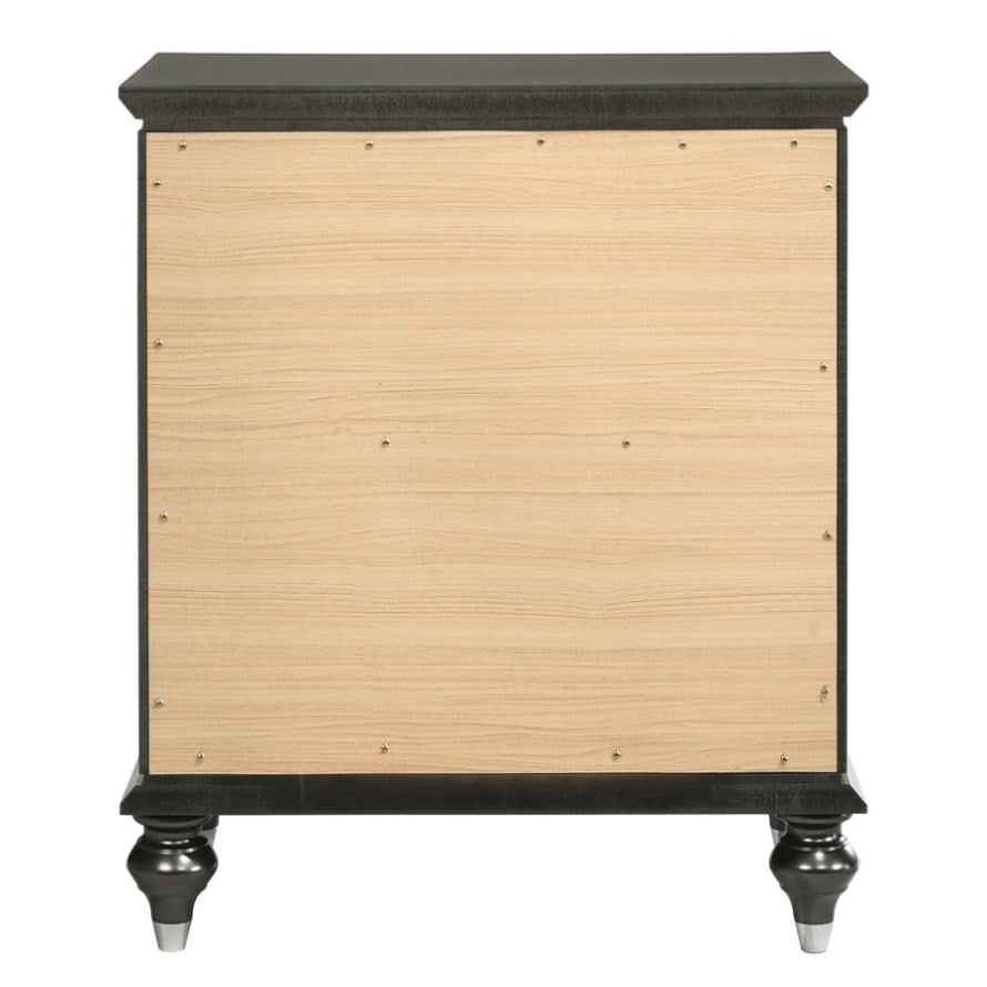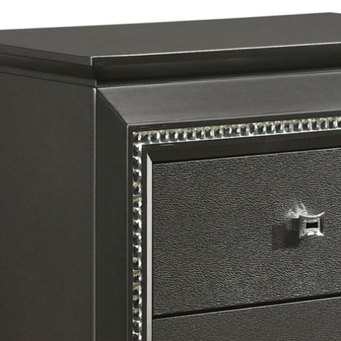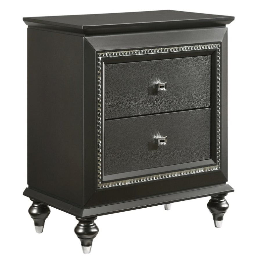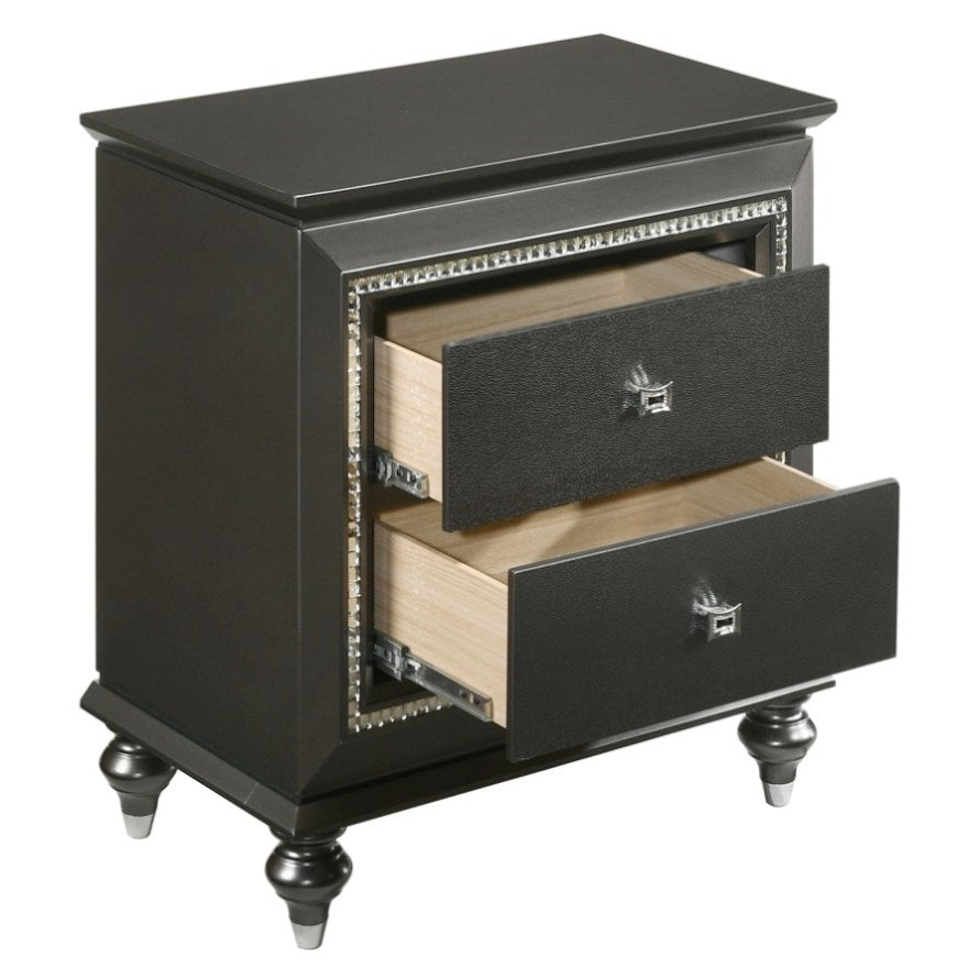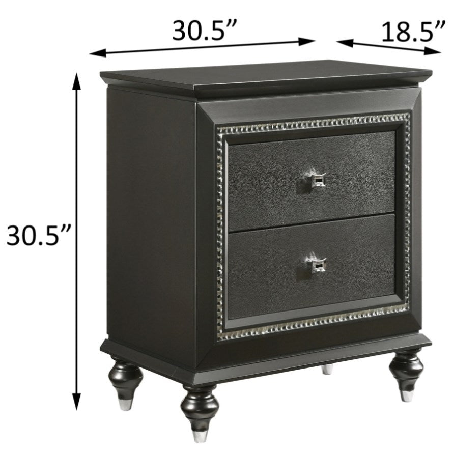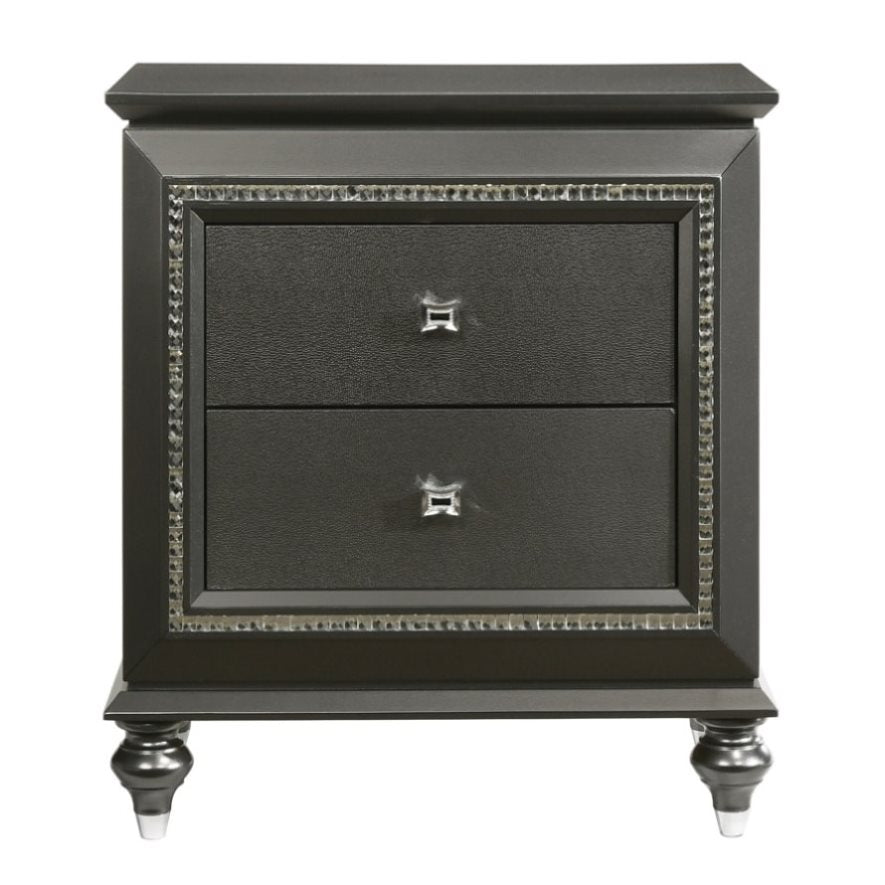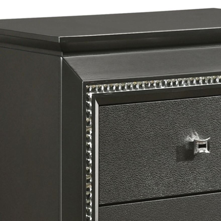 This sleek nightstand boasts a metallic grey finish, infusing your bedroom with contemporary style, while its two spacious drawers ensure ample storage space for your belongings, keeping them organized and accessible. Equipped with safety stops, the drawers offer added functionality and safety, while the transitional design is elevated by sparkling crystal-like trim, adding a touch of sophistication and glamour to your space.