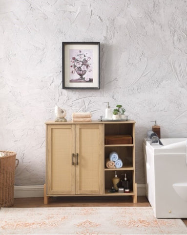 Dual-Door Design with Open Shelves: This cabinet combines two rattan-front doors with three open shelves on the right side, offering a mix of concealed and open storage. Use the doors to hide clutter and the open shelves to display your favorite decor, books, or essentials.