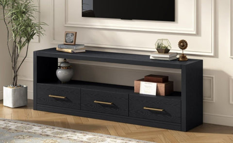 Generous Storage Space:Our TV stand offers abundant storage options with three spacious drawers, providing plenty of room for your media essentials, books, and more. The top surface and drawer fronts are perfect for displaying decor items, ensuring that your living space stays organized and stylish.