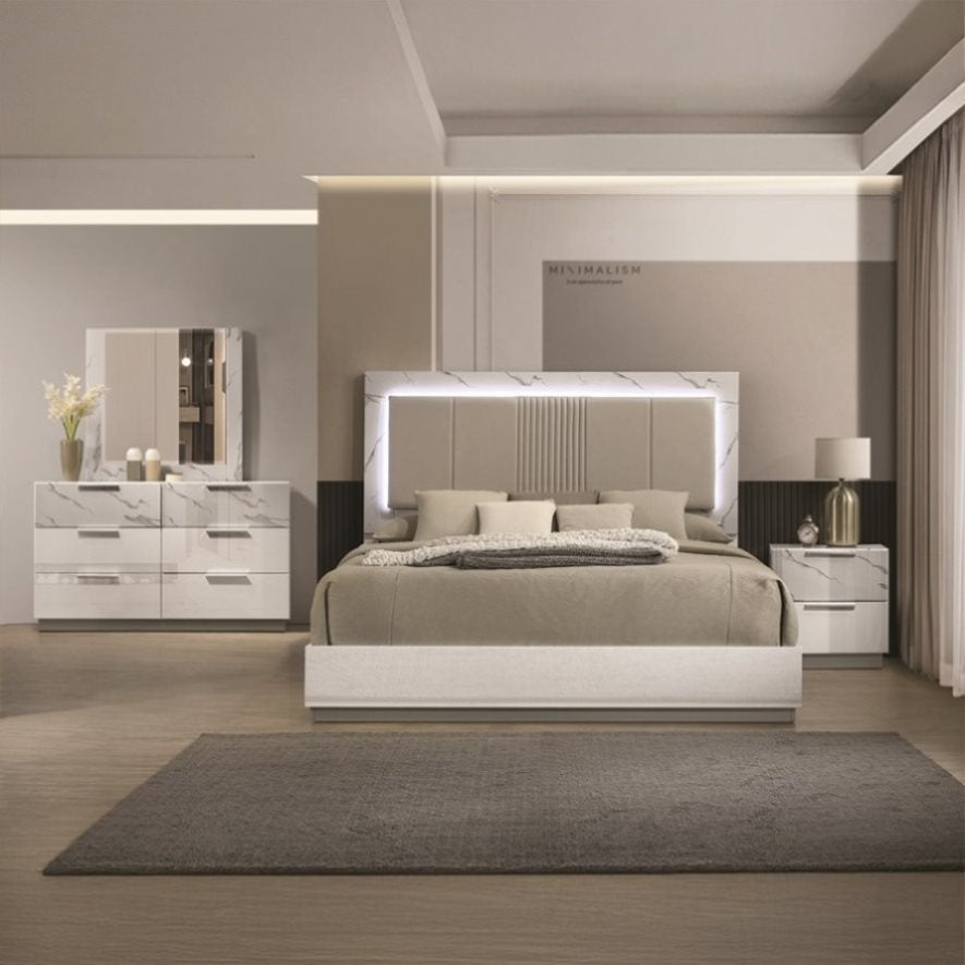 White Lacquer and Marble Accents: Sophisticated look with minimalist appeal.