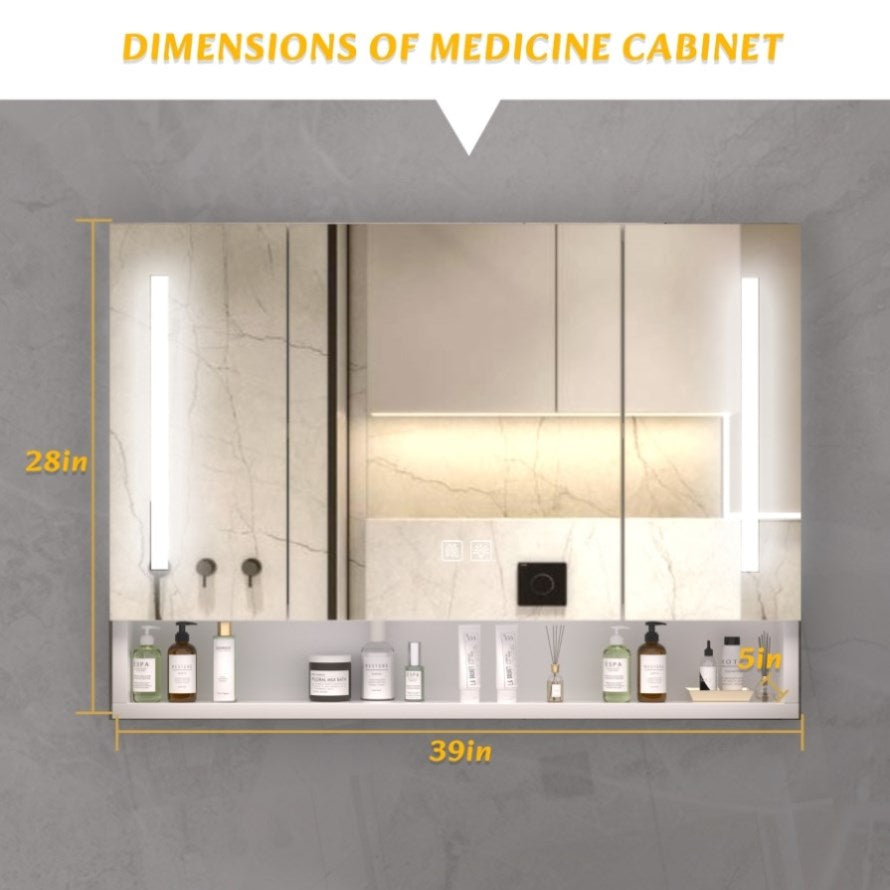 This modern aluminum bathroom medicine cabinet with mirrors and LED lights offers sleek and functional storage for your bathroom essentials. Measuring 39x28 inches, it features multilevel storage compartments to organize your items neatly. The LED lights provide ample illumination, while the mirrored doors create a spacious feel. With its contemporary design, this cabinet effortlessly elevates your bathroom's aesthetic. Easy to install and maintain, it's a practical and stylish addition to any bathroom.