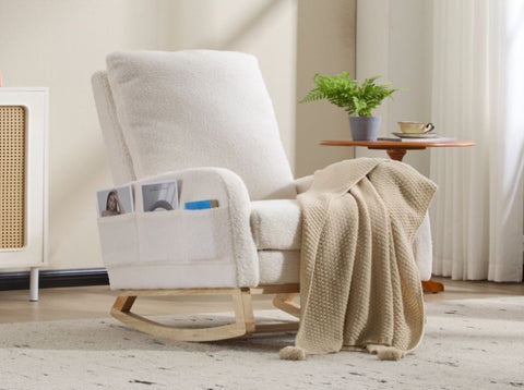 - [Soft Fabric & Practical Side Pocket] Covered with high quality polyester fabric, the surface is breathable and easy to maintain. The simple color and smooth lines make this kids rocking chair very stylish and chic. What's more, there is a pocket on the side of the armrest, which is convenient for you to put magazines and TV controller.
