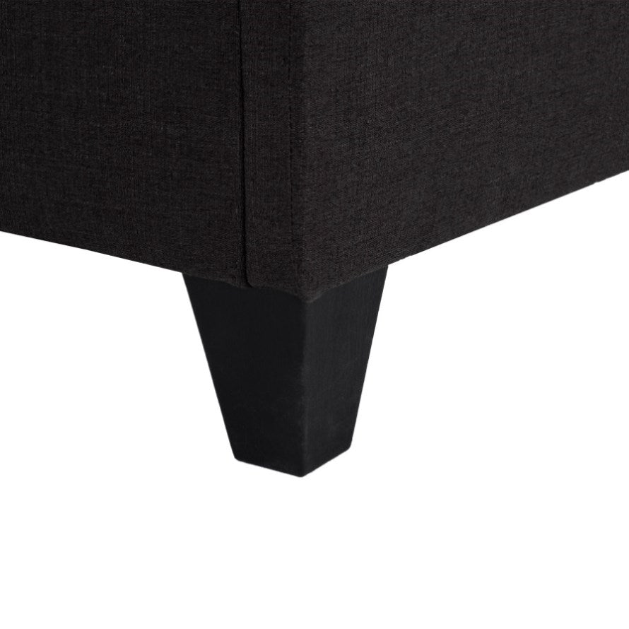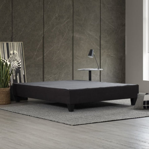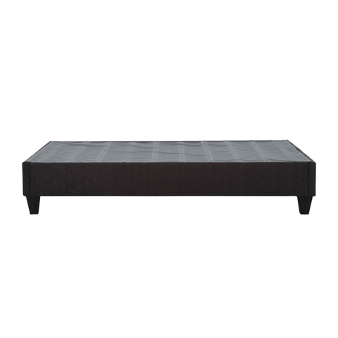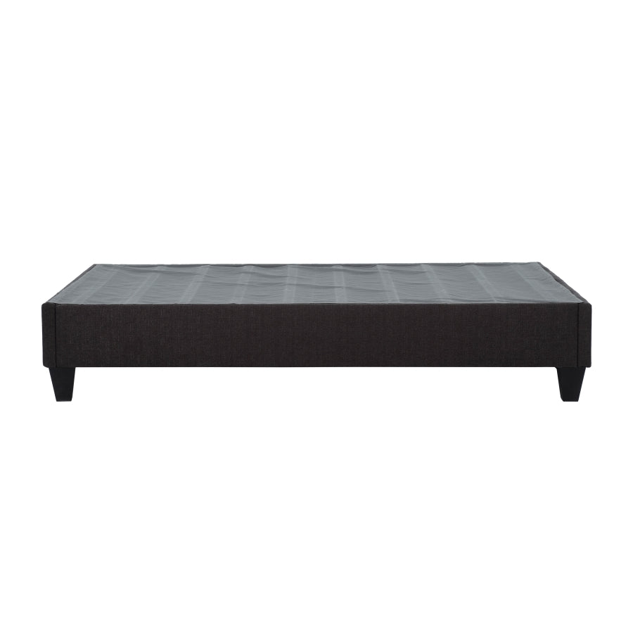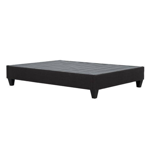 Refresh your bedroom with the cozy minimalism of this upholstered bed frame. This bed frame elegantly combines the functions of a mattress foundation and bed frame to create a contemporary standalone modern platform bed. Featuring a simple wood construction with padded corners for safety and upholstered in dark grey linen, this upholstered wooden bed frame base can create that cozy bedroom you've always dreamed of. With its contemporary, modern look, this simple bed frame is sturdily crafted with solid wood and plywood for night after night of peaceful sleep. Attach your favorite headboard with brackets (both sold separately) to personalize your space. This upholstered platform sturdy bed frame base can sit directly on the floor or become a platform bed by attaching the 14cm-long legs (included) for a higher profile. This gorgeous dark grey bed frame platform will provide you with the coziness and style you are looking for.