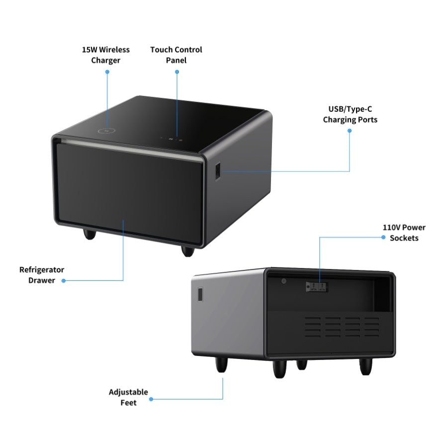 Smart Cooling Drawer: Within the smart side table, a single drawer is designed as a refrigerated storage compartment. It can store items such as beer, cola, tea, fruits, and snacks, each in its respective partition. You can also accurately adjust the temperature to preserve the freshness of your treasures. The adjustable refrigerator temperature range for the drawer is 37-46°F.