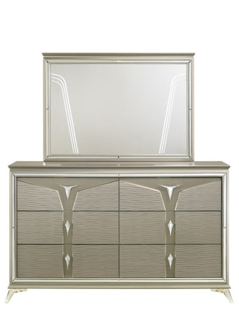This wood dresser is a stylish storage solution designed with a contemporary flair. Six spacious drawers offer ample room for your clothing and essentials, while the wood drawer handles adorned with mirror accents add a touch of sophistication. It effortlessly complements the modern aesthetic of the collection, providing both functionality and visual appeal.