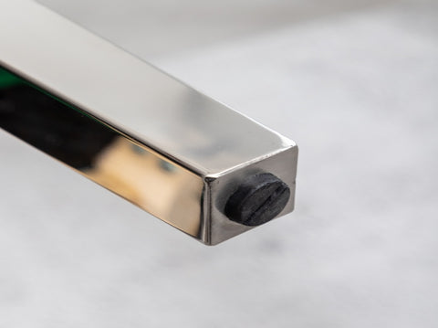 Solid wood frame with sleek stainless steel legs bring it stability as well as bold, contemporary finishing touch