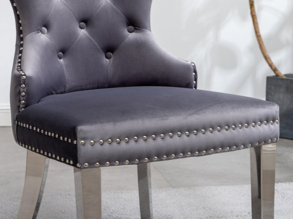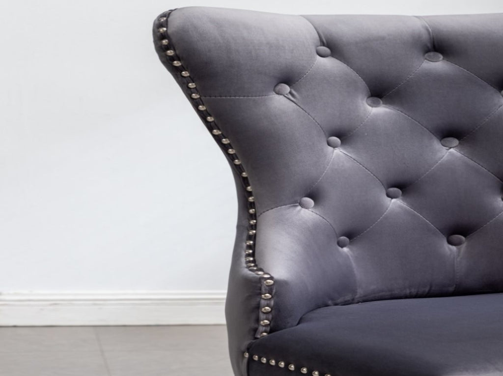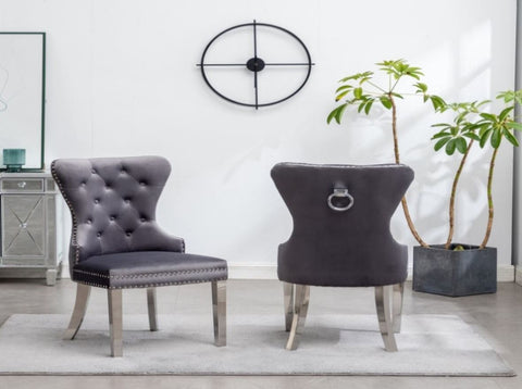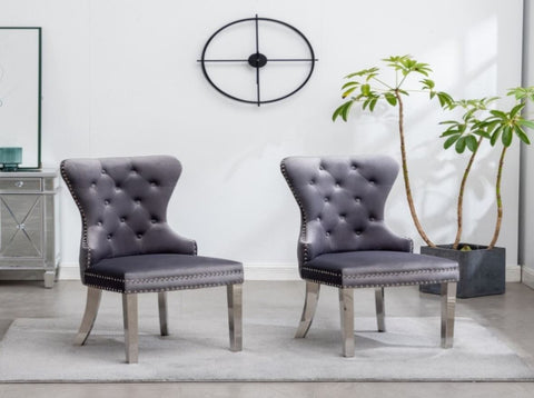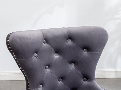 This set includes two chairs. Beautiful button tufting and with soft velvet upholstery, a decorative ring at the back of the chair