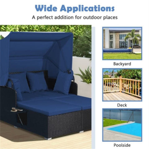Navy Rattan Daybed Lounge W/ Retractable Top Canopy Side Tables Cushions 50299606