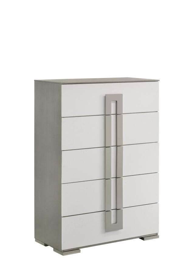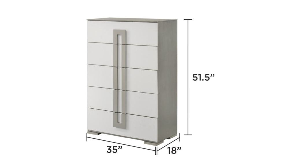 Elevate your bedroom's storage with this contemporary chest, featuring a sleek semi-gloss white finish that exudes modern elegance. The chest's tall design offers ample storage with multiple drawers, perfect for organizing your clothing and accessories. Accentuated by oversized handles, this piece combines functionality with a stylish aesthetic, making it a standout addition to any bedroom decor.