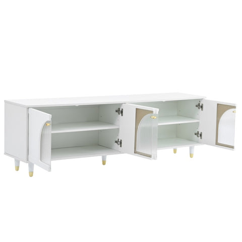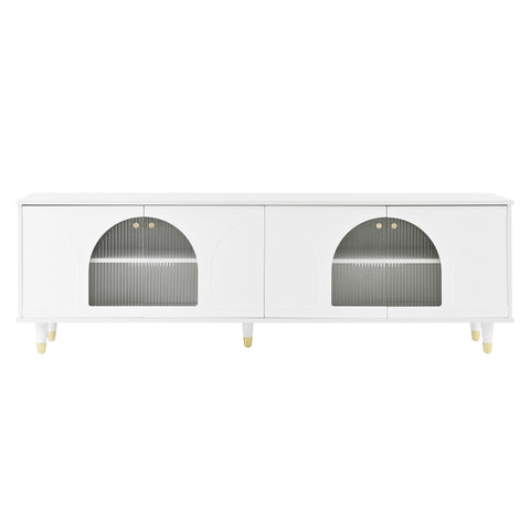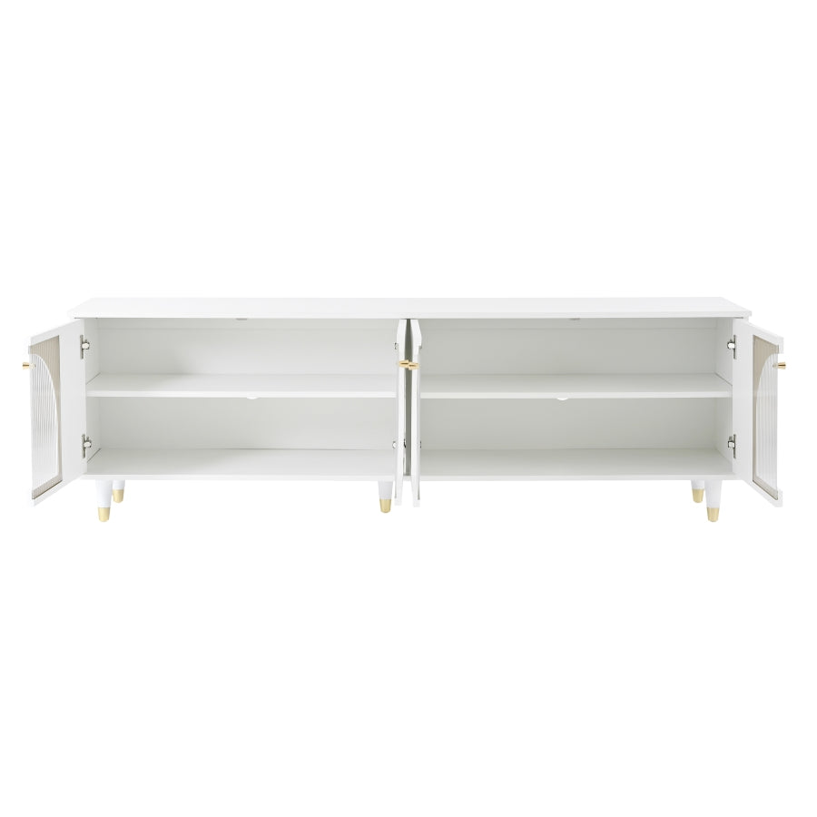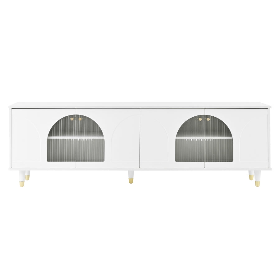 This TV cabinet is designed with arched form fluted glass doors, golden handles, and unique legs wrapped in golden stripes, showing a stylishly simple and elegant feeling. It can be easily integrated into various home styles, showing distinctive decoration tastes.