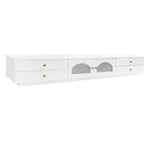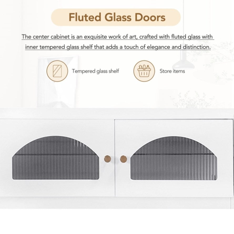 The center cabinet is an exquisite work of art, crafted with fluted glass with inner tempered glass shelf that adds a touch of elegance and distinction. The glass element is transparent, allowing you to easily see and access the items stored within, while also adding a touch of modernity and cleanliness to the cabinet's appearance.