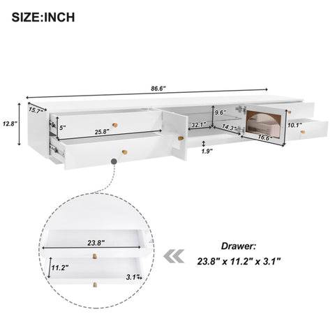 | Detailed Measurement | Overall: 86.6''W x 15.7''D x 12.8''H / Drawer: 23.8''W x 11.2''D x 3.1''H / Cabinet: 32.1''W x 14.3''D x 9.6''H |
