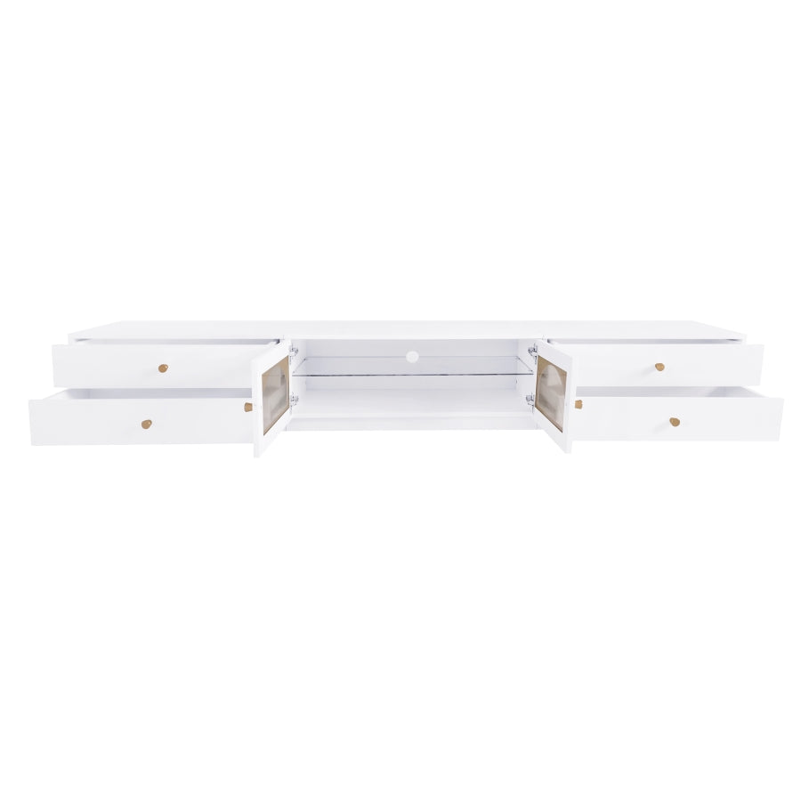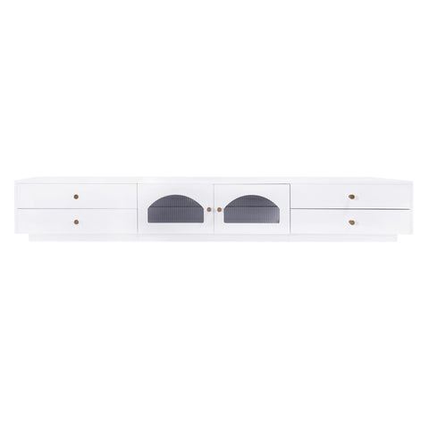The TV stand boasts sleek and modern design with smooth lines and a pure color scheme with metal handles, creating a visually appealing accent to any living space.