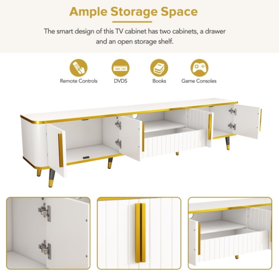 This TV cabinet integrates the simple line design and the embellishment of golden elements, not only showing the modern fashion style, but also exuding a hint of luxury and elegance.