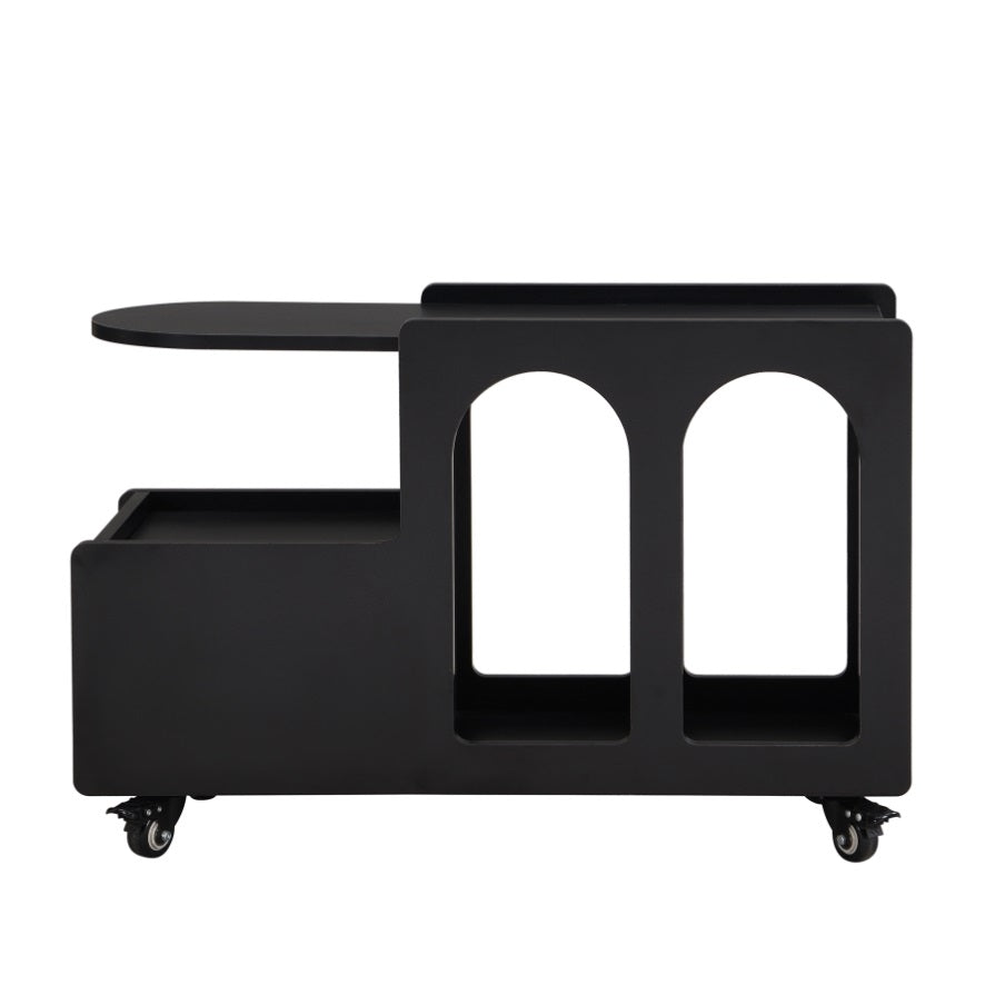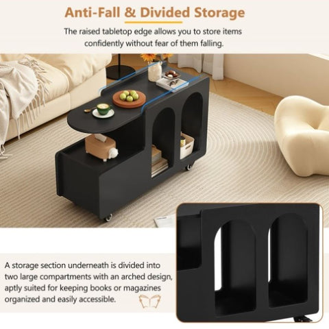The raised tabletop edge allows you to store items confidently without fear of them falling. A storage section underneath is divided into two large compartments with an arched design, aptly suited for keeping books or magazines organized and easily accessible.