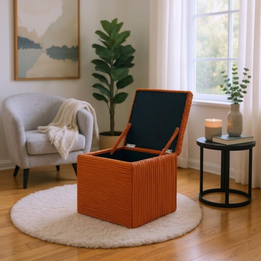 Despite its small footprint, the ottoman opens to reveal a surprisingly spacious interior compartment — ideal for storing small blankets, accessories, or remote controls. Its sturdy cushioned top provides extra seating or a comfy footrest, while the 2.5cm-high black rubber feet keep it elevated, stable, and floor-safe.