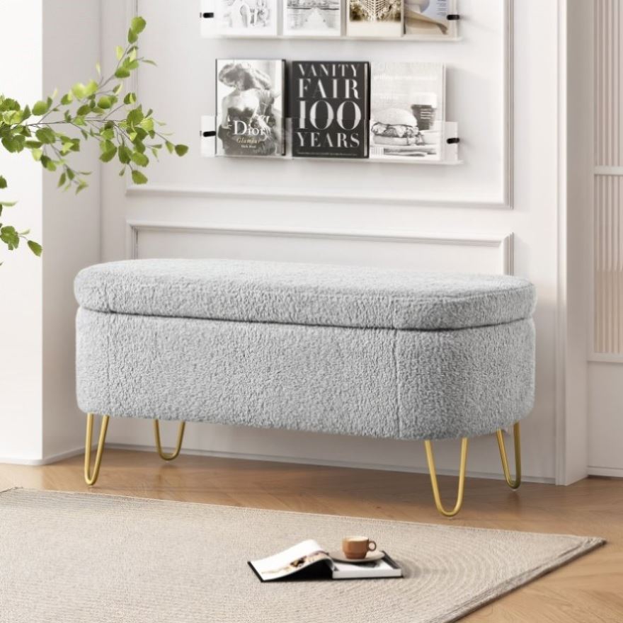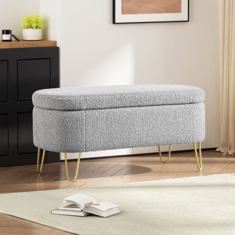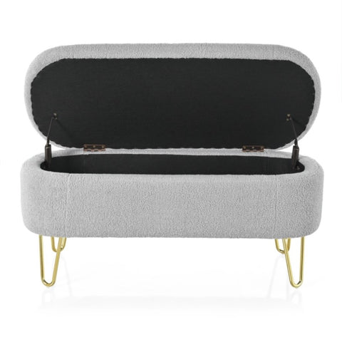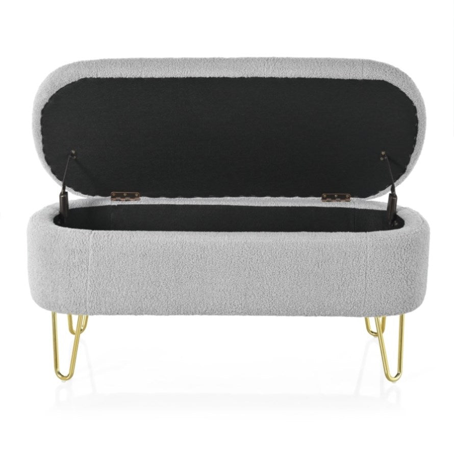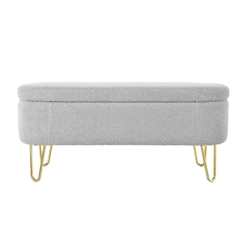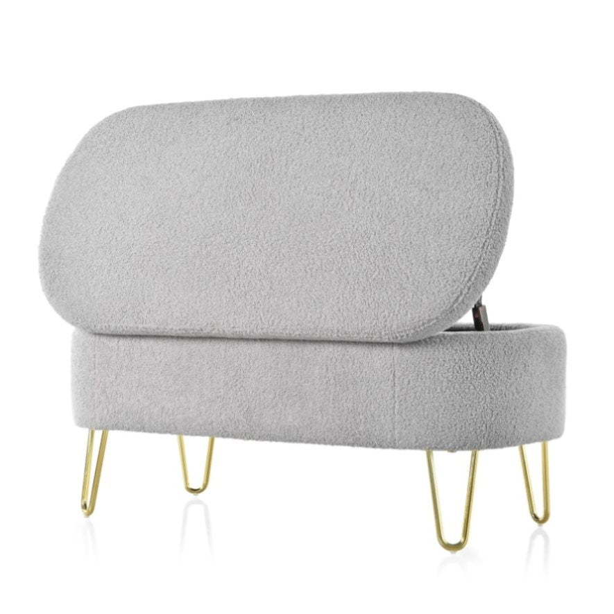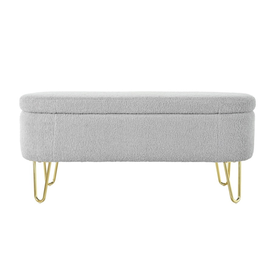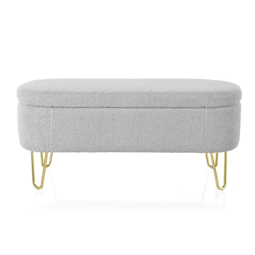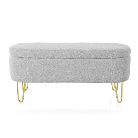 Elegant Design: This long, oval-shaped storage ottoman features sleek gold metal legs that add a touch of modern elegance to any interior decor. Available in classic gray and off-white, it effortlessly blends into various color schemes.