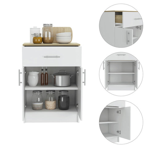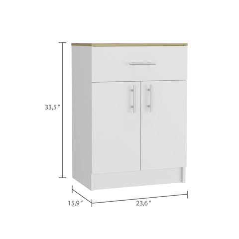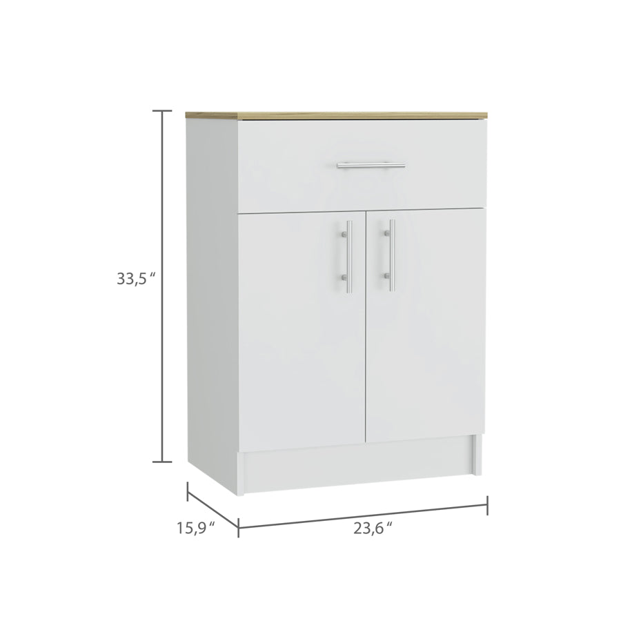 This pantry cabinet is an ideal storage solution for organizing your kitchen. With a compact and functional design, it features a drawer and two doors, offering ample space to store utensils, food items, and other kitchen essentials. Made from melamine and particleboard, it ensures durability and sturdiness. Measuring 23.6 inches wide, 33.5 inches high, and 15.9 inches deep, it is perfect for small spaces without compromising on storage capacity.