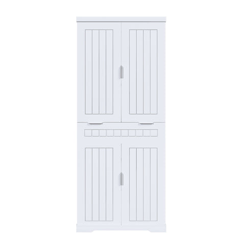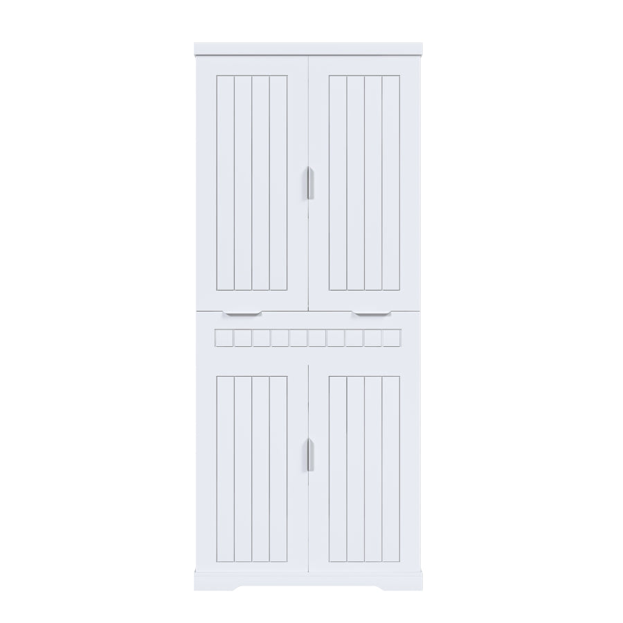 Elegant Farmhouse Design:Featuring classic beadboard cabinet doors and stylish silver diamond-shaped handles, this pantry cabinet adds rustic charm to any space. The clean lines and neutral white finish seamlessly complement modern farmhouse, traditional, or contemporary decor styles in kitchens, dining rooms, or hallways.