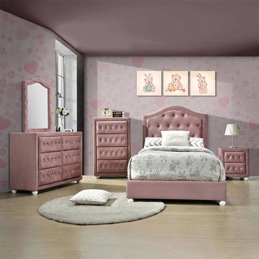 This elegant furniture piece features four spacious drawers for organizing clothing, accessories, and personal belongings, each equipped with side metal glides that extend 3/4 of the way for smooth and effortless access. Adorned with crystal-like pull knobs for a touch of sophistication and fully padded case-leg construction for stability and comfort, this piece combines ample storage, aesthetic appeal, and durability, making it a stylish and functional addition to any room.
