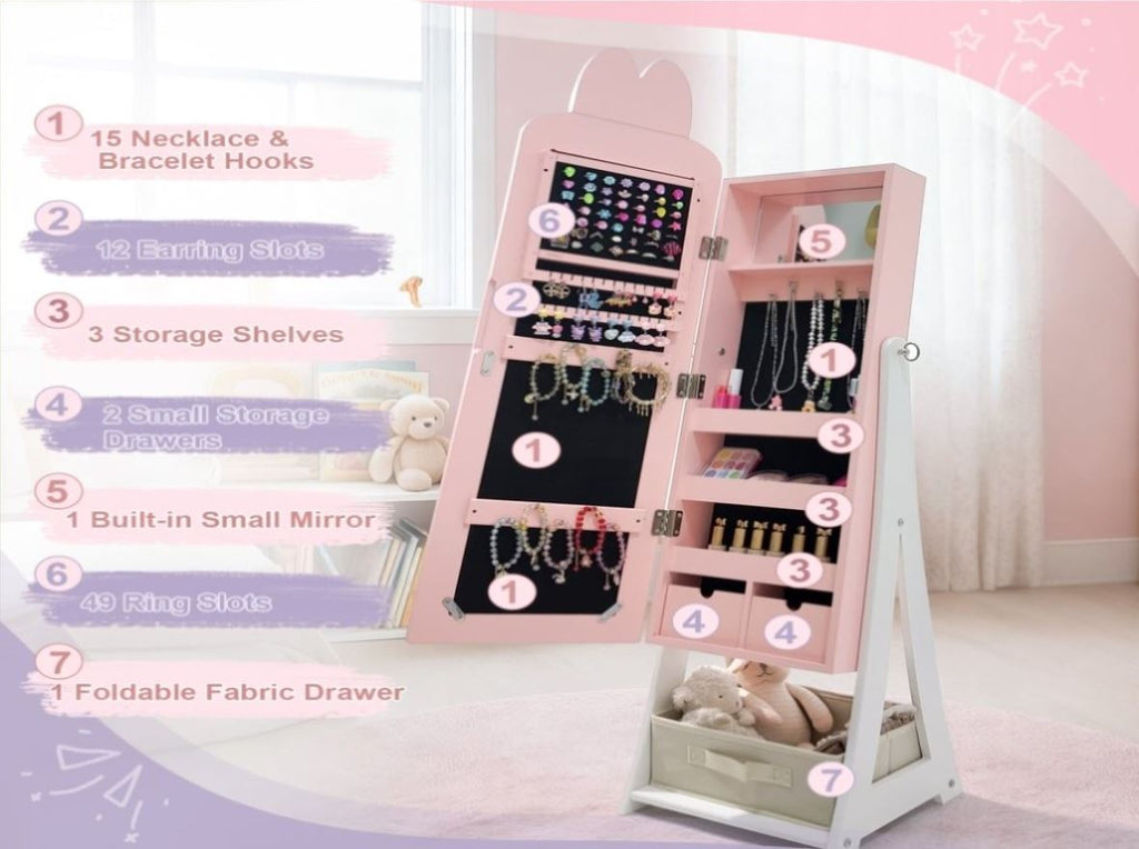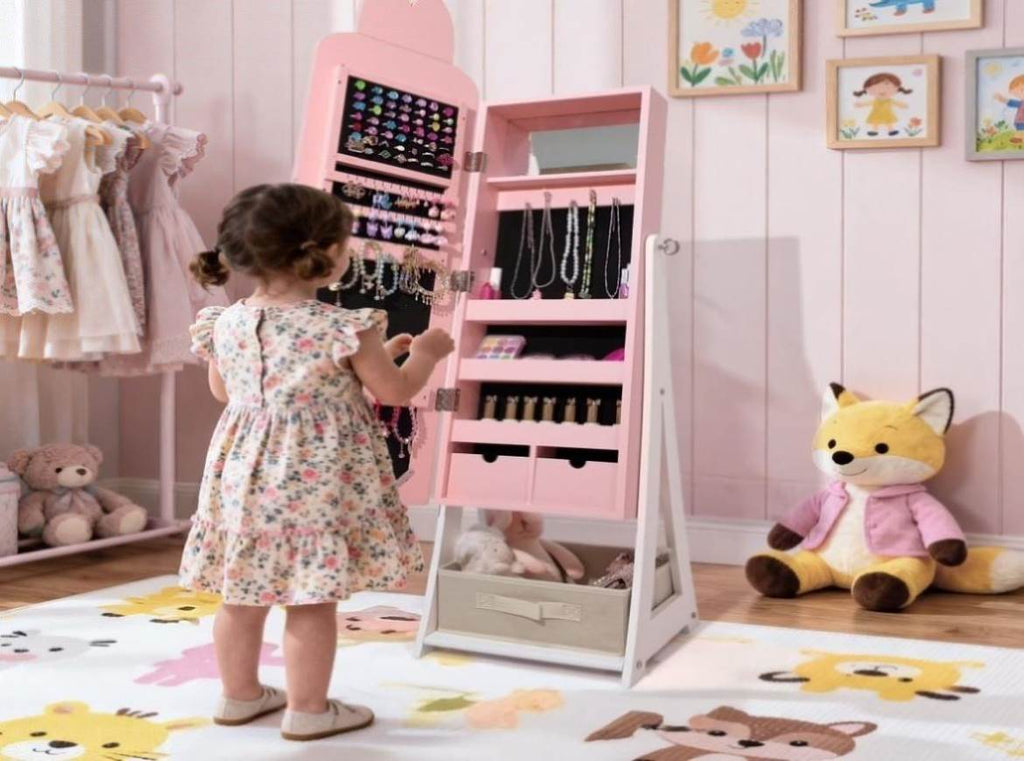 The clever combination of a single door compartment and a soft fabric drawer offers versatile storage. The door conceals hanging necklaces or larger items, while the fabric-lined drawer safely stores smaller, delicate accessories like rings and hairpins without causing scratches, keeping everything organized and accessible. -