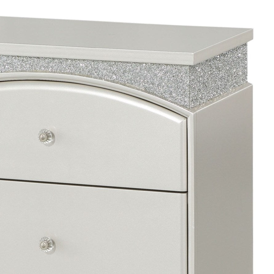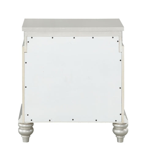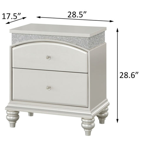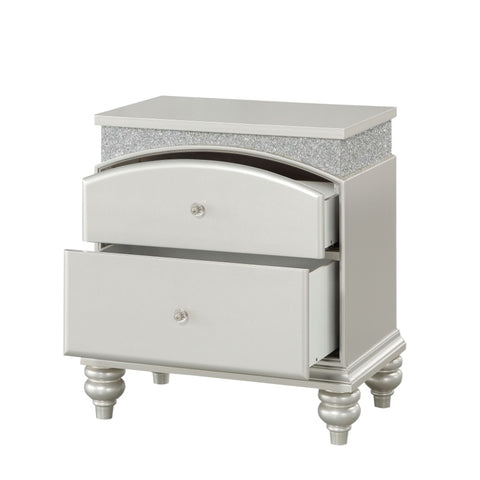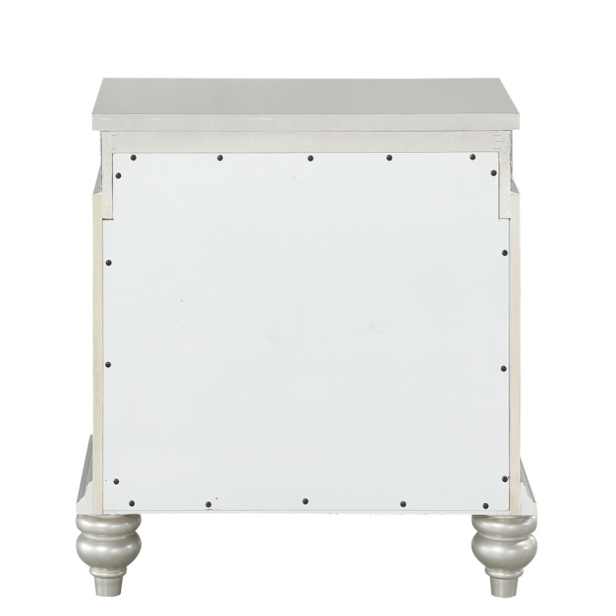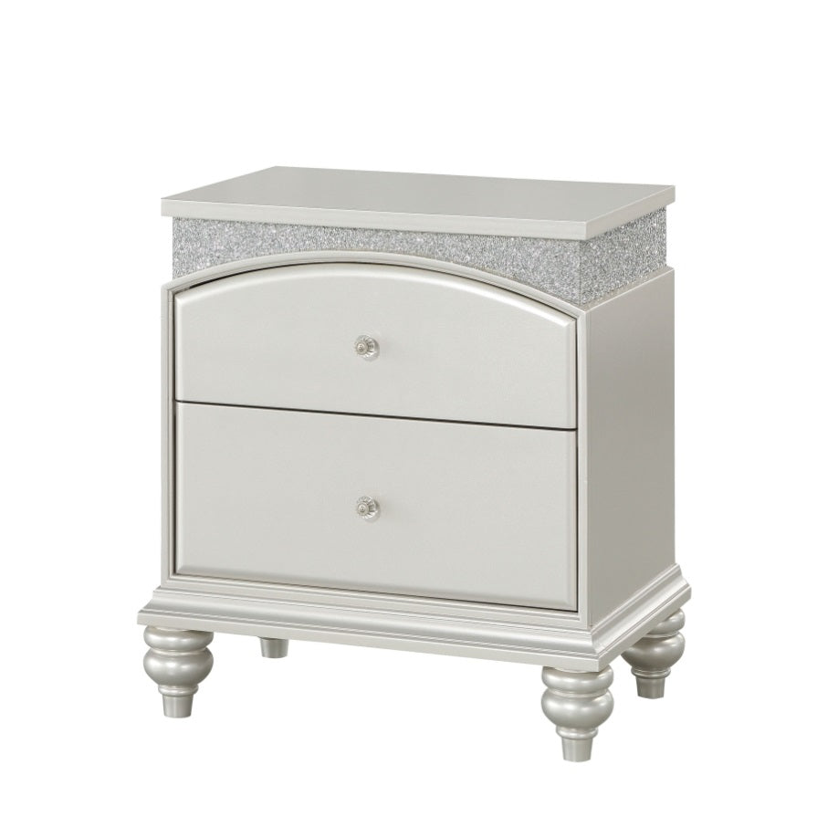 Elevate your bedroom with this transitional nightstand, offering ample storage space for bedside essentials in its two drawers, while its platinum finish brings a touch of luxury and refinement to your decor. Keep delicate items safe and protected in the felt-lined top drawer, while enjoying smooth and secure operation with each drawer's safety stop mechanism, preventing accidental falls or damage.