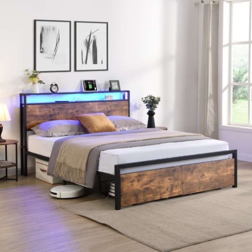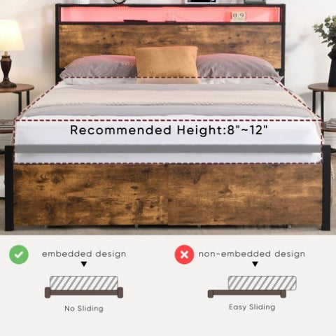 Smart RGB Led Bed Frame Queen: This Led bed frame features with Led-lit headboard for ambient mood lighting and the combination of rustic-wood and metal accents for industrial appearance. More than 60,000 color to be choose from, brightness, flash mode, timing, etc., can use the equipped remote control or mobile APP to set free easily. Change the led color to meet your needs of different styles and make the atmosphere more vivid! Also make your home life more colorful.