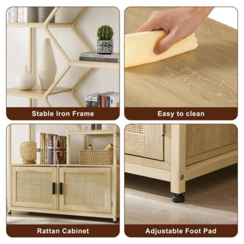 This bookshelf comes with 1 natural rattan storage cabinets and 7 open display shelves.