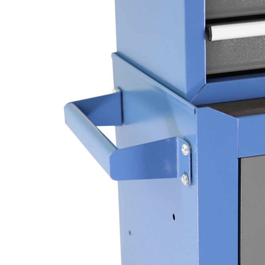 1 rolling tool cabinet on the bottom and 1 top box equipped with 3 drawers on the top. The whole tool chest can be disassembled into two parts and the top box can be placed into the large bottom box to save space or even carry it conveniently. For easy transportation, we will put the upper case into the bottom cabinet.