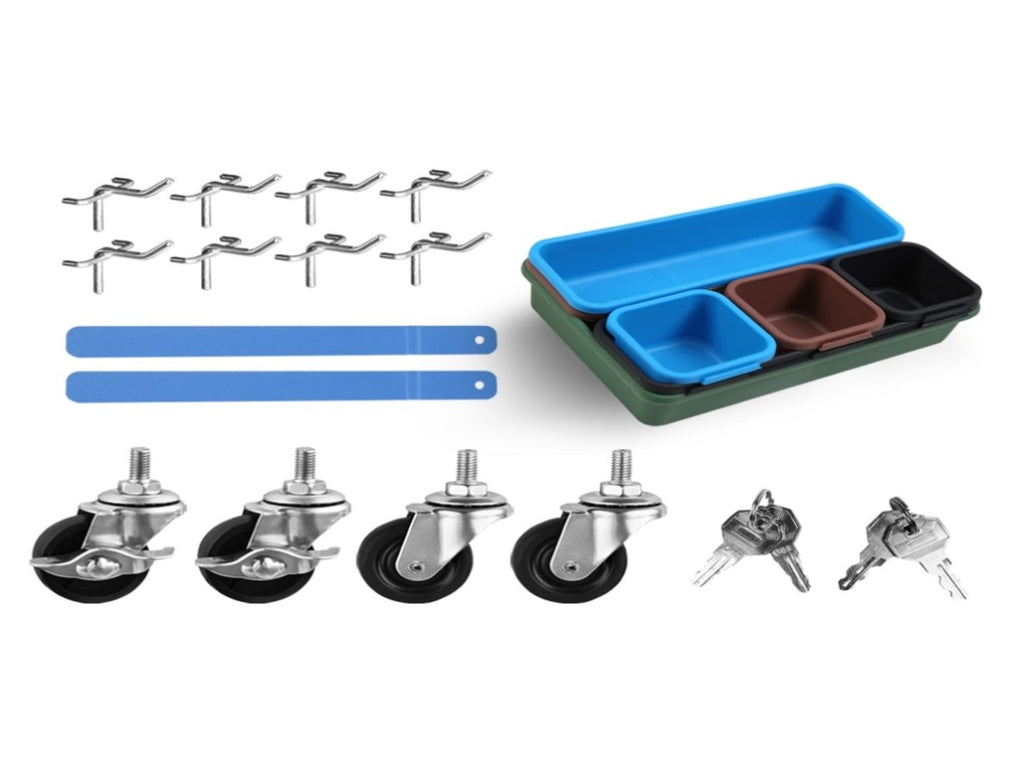 HIGH CAPACITY. Rolling tool box is equipped with 8 sliding drawers: 2 large, 3 medium & 3 small, 1 top layer, and 1 bottom cabinet, to store tools of different sizes and meet your needs. Each drawer is designed with a liner. Tool chests & cabinets has 8 hooks beside of cabinet, hanging tools. We also provide you with 7 storage boxes.