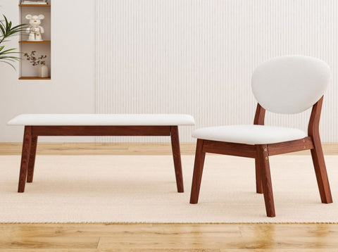 3.Comfortable Upholstered Seating: All 4 chairs and 1 bench come with soft beige cushions, filled with high-density foam for optimal comfort and support. The upholstery fabric is skin-friendly, breathable, and easy to clean with a damp cloth.