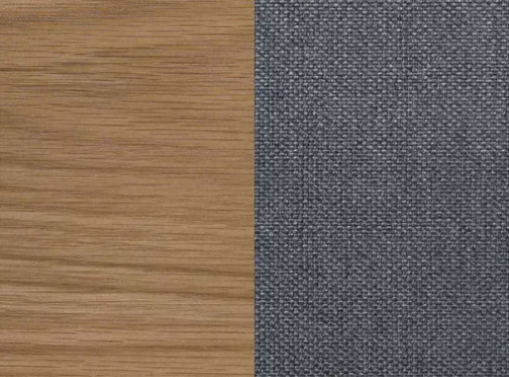 The blue linen-like fabric upholstery creates a vibrant and eye-catching contrast against the natural finish