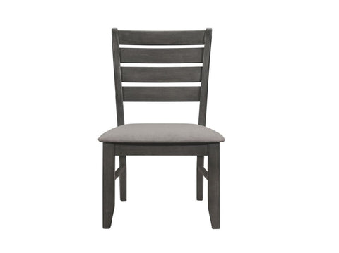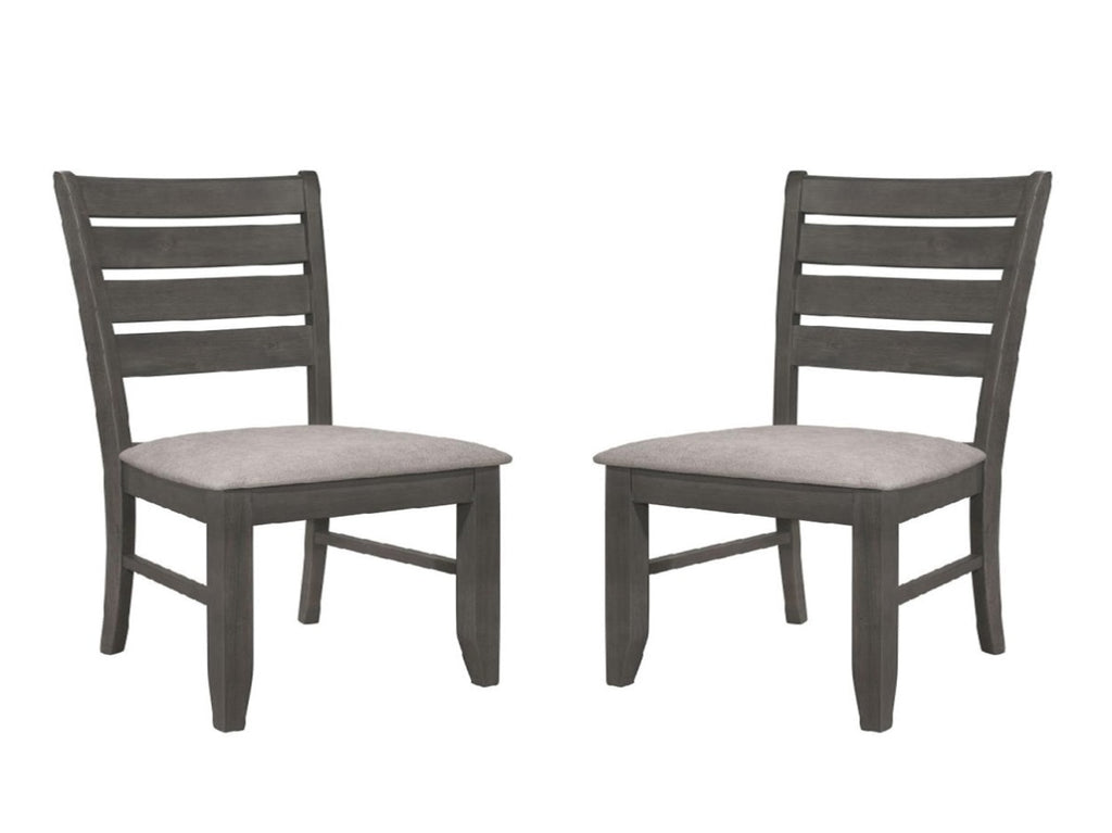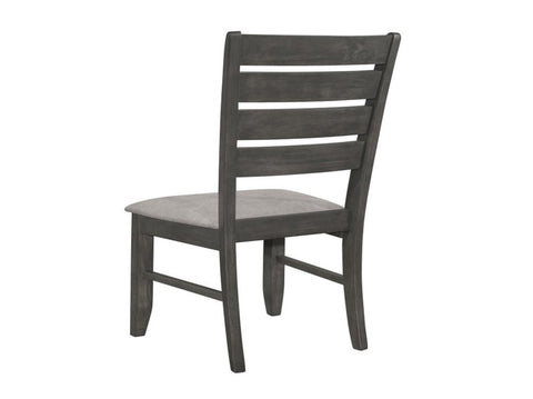 Add a timeless look to dining spaces with these ladder back side chairs. Elegant and simple, these contemporary side chairs bring a casual expression to a dining table, inviting family and guests to rest comfortably for brunches and dinners alike. Designed with cushioned seats upholstered in a soft, grey fabric, each ladder back dining chair is as comfy as it is stylish. The contrasted dark grey finish gives their modern farmhouse-inspired frames a neutral tone that matches with countless color palettes. Slide these dark grey side chairs up to a dining table for a sleek, bold aesthetic, thanks in part to the chunky straight legs.