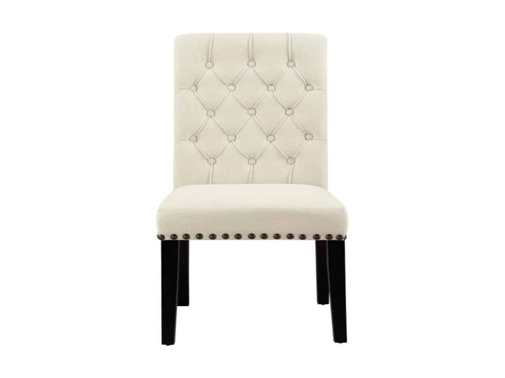 This dining chair celebrates style with a lovely beige fabric upholstery. Linear design offers an armless profile with tapered legs. A tufted seat back and nailhead trim build its personality with a touch of character. Contrast created by deep finished legs shapes the décor allure of this exceptional dining chair.
