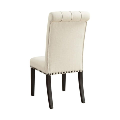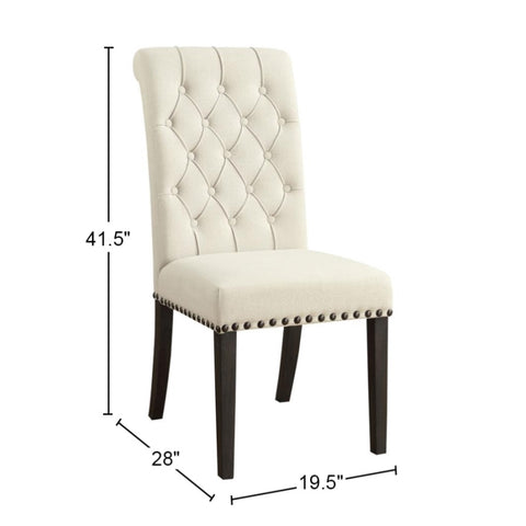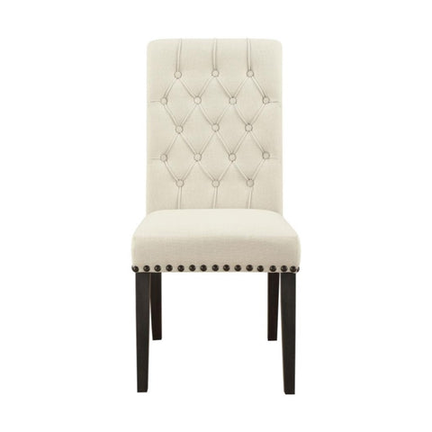 Blending timeless elegance with plush comfort, this side chair enhances any dining space. Its high backrest features a classic button-tufted design, adding depth and sophistication. A rolled top and hand-applied nailhead trim create refined detailing, while the generously padded seat ensures lasting comfort. Supported by sturdy, tapered legs, this chair is built for both beauty and durability. Whether part of a formal setting or an inviting everyday dining space, it brings grace and charm to the table.