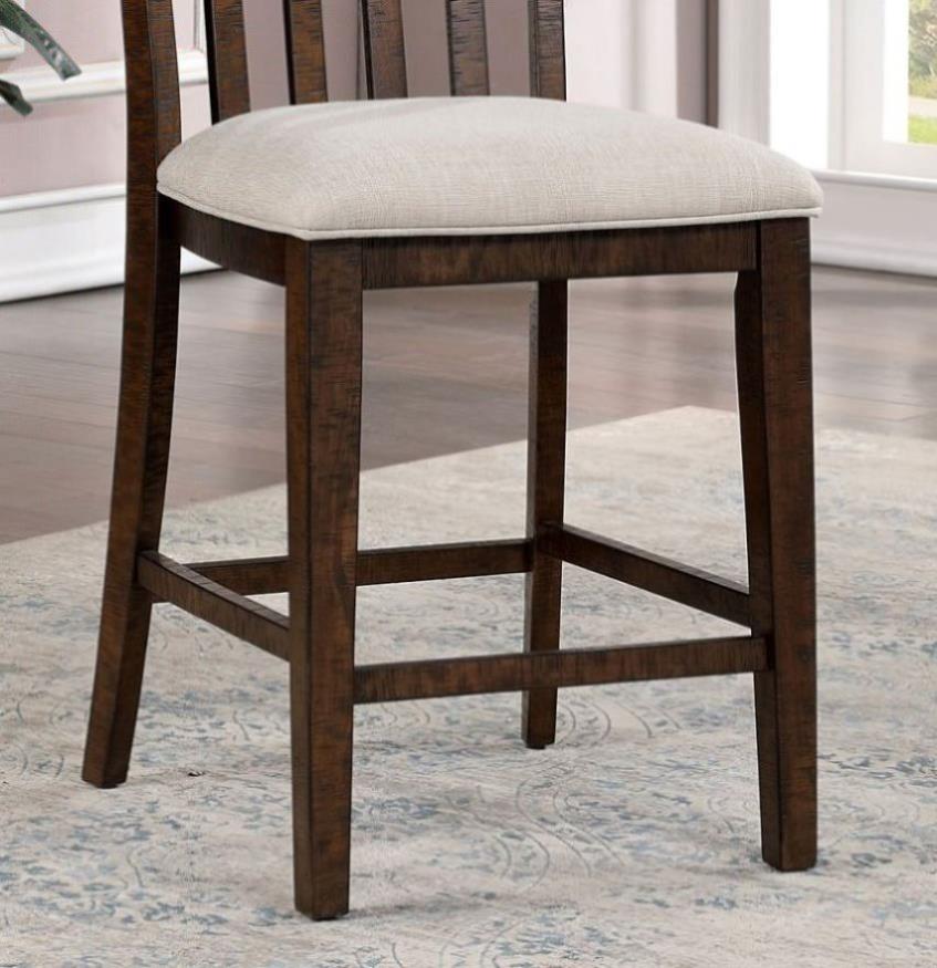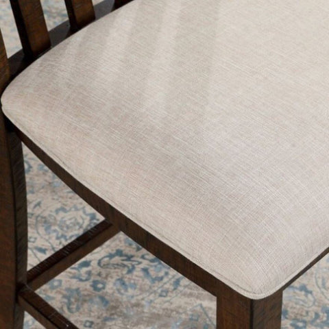 With its earthly rustic oak finish, this counter set is the epitome of barnyard design excellence. The solid wood chair features a unique slat-style back made of planks, laid out beautifully with its wood grain patterns. It shares the same finish as the rest of the set but with a slight twist--the fabric cushion is in a light beige shade, designed with welts to spruce up the clean and crisp silhouettes of the set.
